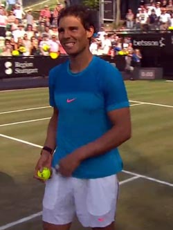 Rafa Nadal debutó con victoria en la hierba del torneo de Stuttgart tras doblegar al chipriota Marcos Baghdatis por 7-6, 6-7 y 6-2. A pie de pista nada más concluir el encuentro, Nadal confesó que el partido se había alargado más de dos horas y media, situación que ha aprovechado para coger ritmo y estar preparado para enfrentarse al siguiente rival, el australiano Bernard Tomic.